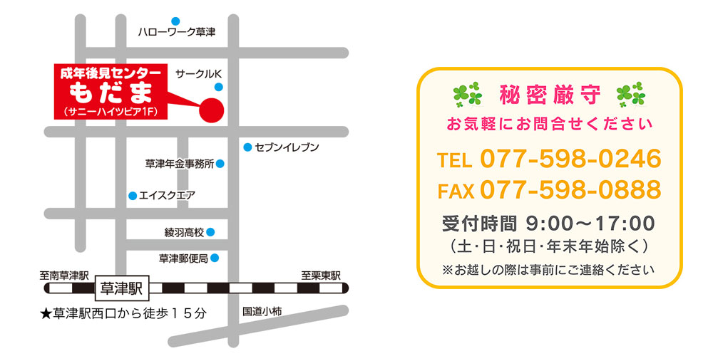 〒525-0027 滋賀県草津野村8丁目5番19号 サニーハイツピア105号室 ※サークルKのとなりの黄緑色のハイツ、1階中央です(駐車場あり)